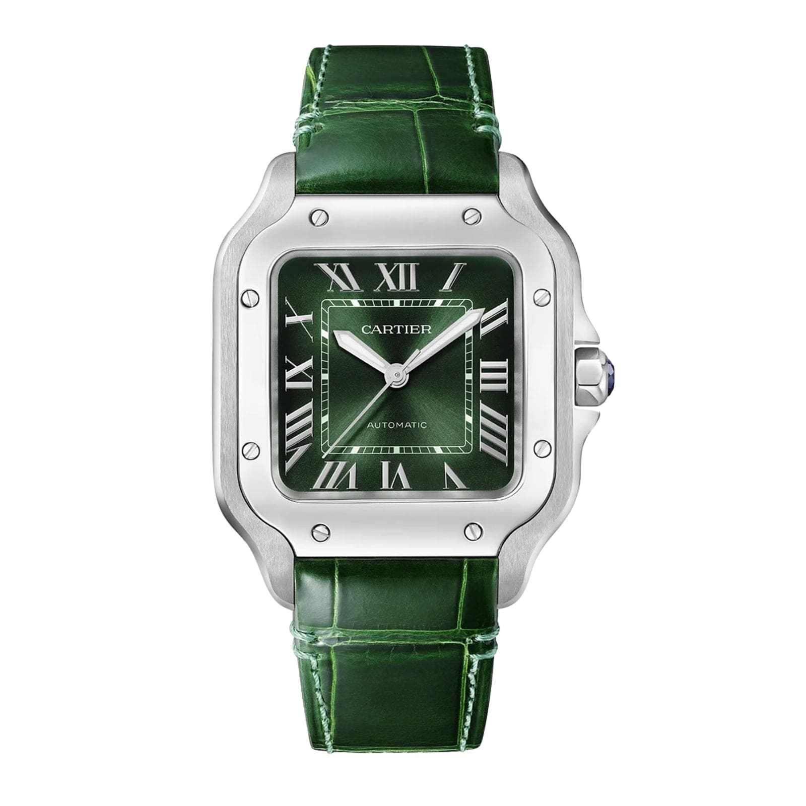 Santos de Cartier – precision meets minimalism Dedicated to aviation pioneer Alberto Santos-Dumont Presented in a beautifully proportioned square steel case Graduated green dial with polished steel sword-shaped hands Powered with precision by the calibre 1847 MC self-winding mechanical movement with a 40-hour power reserve A SIGNATURE AESTHETIC Created in 1904, the Santos de Cartier collection pays tribute to aviation pioneer Alberto Santos-Dumont who inspired the original watch. Based on the concept of form, a taste for minimalism, the precision of proportions, and an eye for detail, the collection is characterised by its square case with rounded corners and functional screws that are deliberately left visible. AN EYE FOR DETAIL This 41.9 x 35.1mm watch is presented in a steel case with rounded corners and visible screws. A 7-sided crown with a vibrant faceted blue spinel adds to the signature aesthetic. The graduated green dial is rich and luxurious, with a sunray finish, steel Roman numerals, and steel sword-shaped hands. This statement timepiece is supplied with two straps – one in green alligator leather and the other in steel – allowing you to configure an accessory that feels uniquely yours. Water resistant to 10 bar (100 metres) and equipped with a calibre 1847 MC self- winding mechanical movement, this exquisite model prioritises function and form.