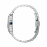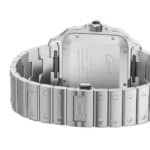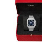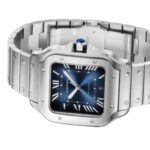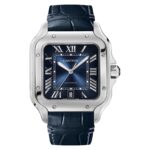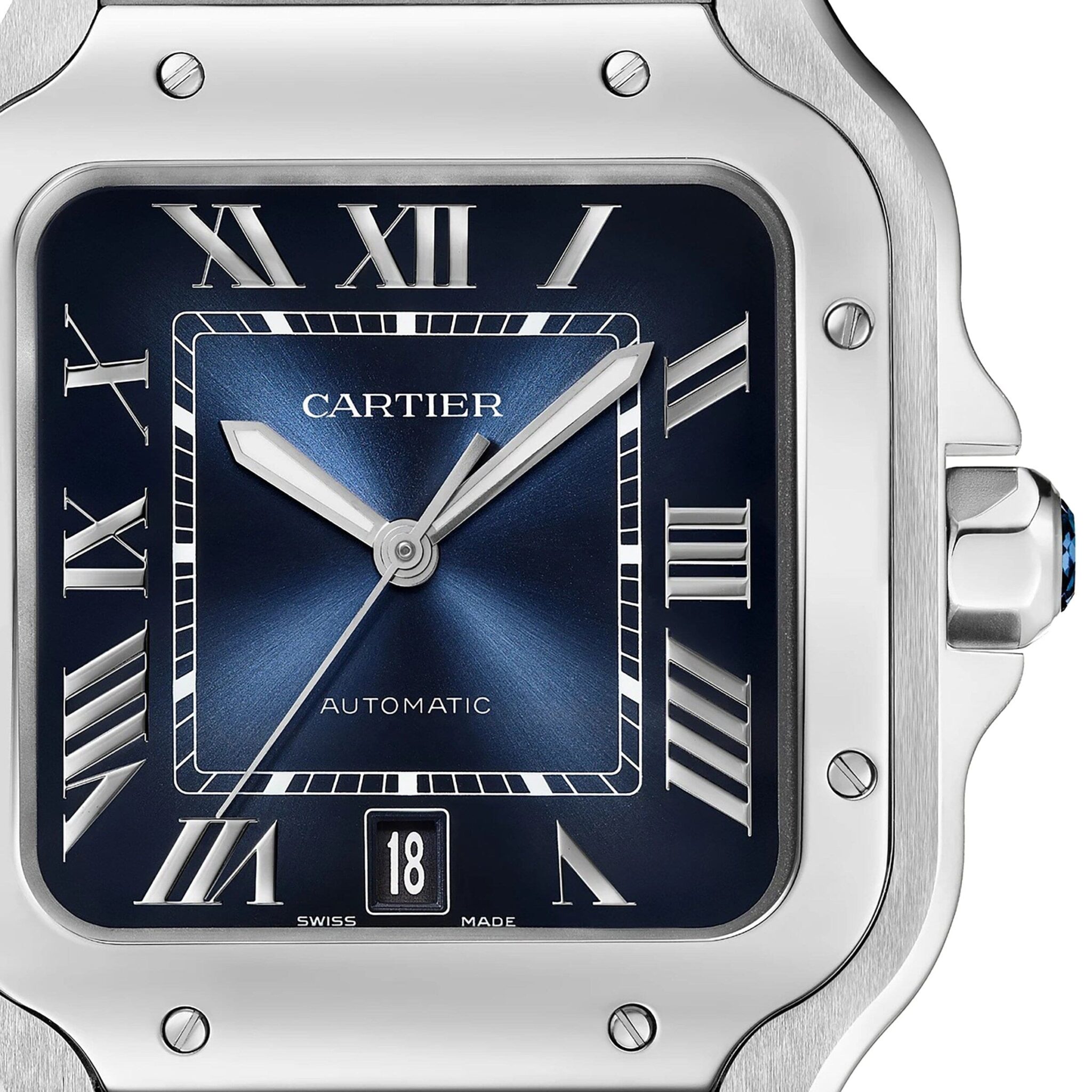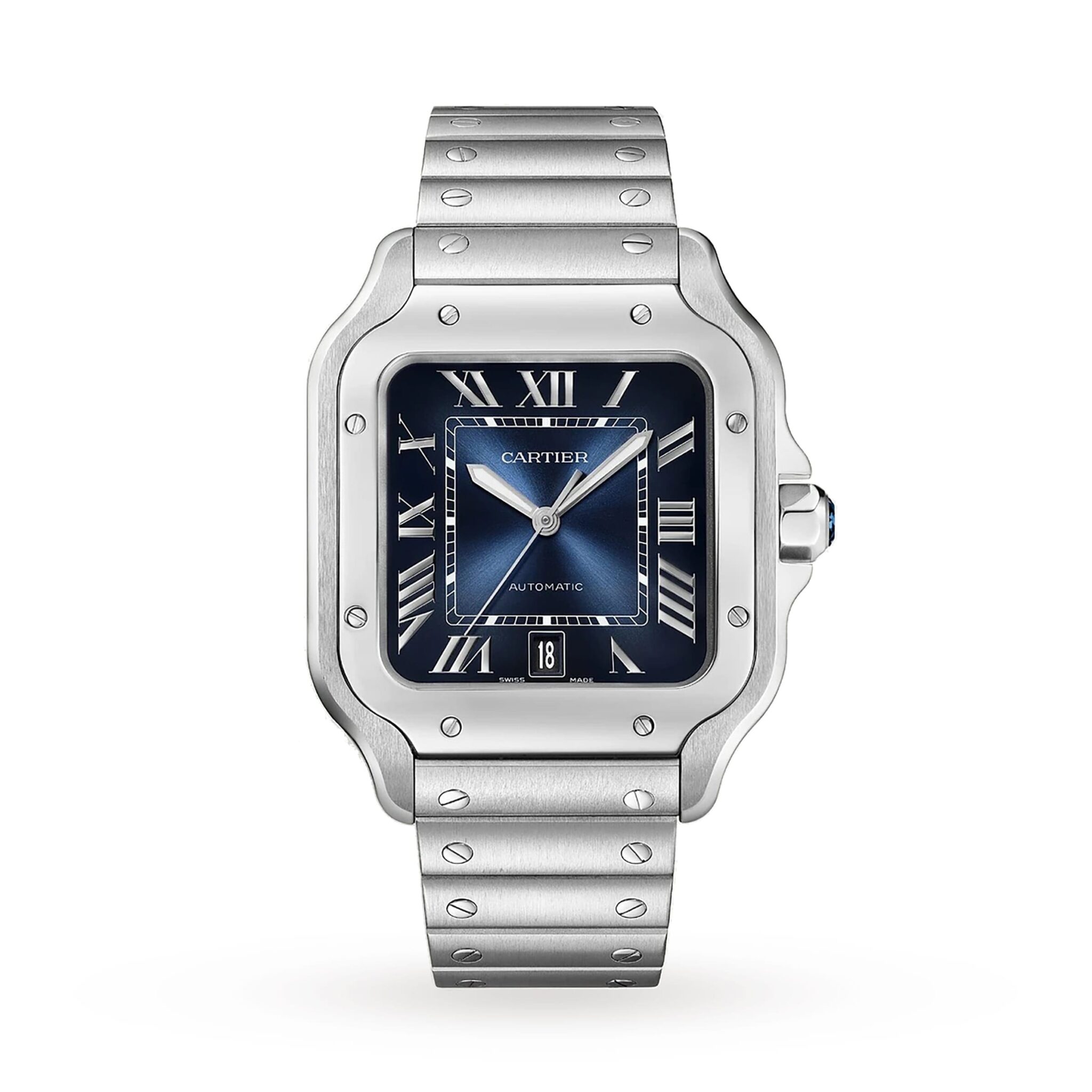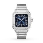 Santos de Cartier watch, large model, mechanical movement with automatic winding 1847 MC. Steel case, 7-sided crown with synthetic faceted blue spinel, graduated blue dial, polished steel sword-shaped hands with luminescent material, sapphire crystal. Steel bracelet with SmartLink adjustment system. Second strap in blue alligator skin, with interchangeable folding steel buckle. Both are fitted with the QuickSwitch interchangeable system. Case width: 39.8 mm, thickness: 9.38 mm. Water-resistant up to 10 bar (approx. 100 metres).