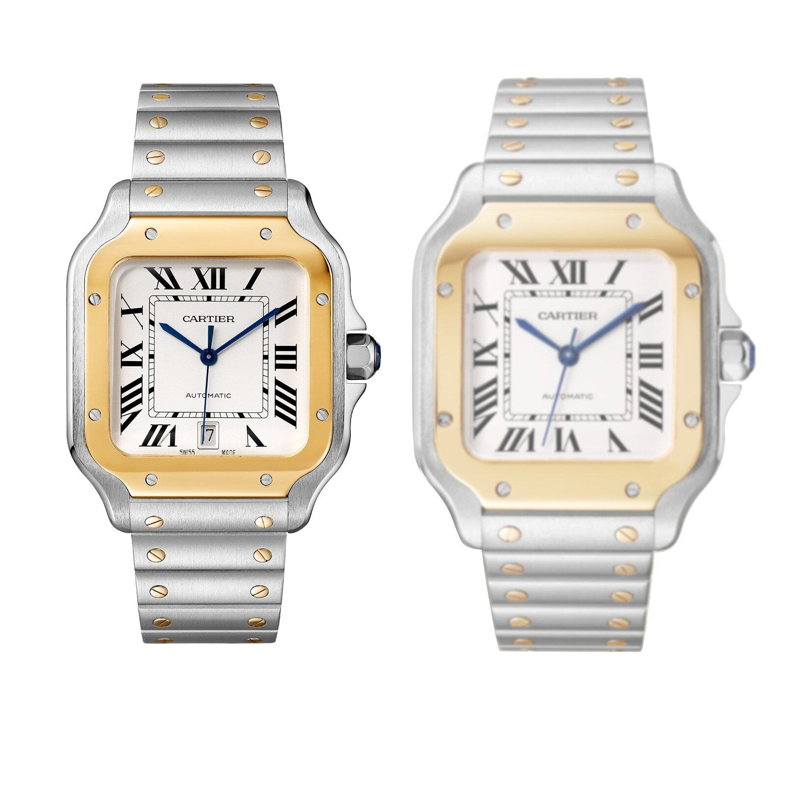 Santos de Cartier – where precision meets minimalism A tribute to aviation innovator Alberto Santos-Dumont Encased in steel and 18K yellow gold Silvered opaline dial with the classic Cartier blued-steel sword-shaped hands and a date display Driven by the calibre 1847 MC self-winding mechanical movement for precision and dependability PRECISE PROPORTIONS AND REFINED DETAIL First introduced in 1904, the Santos de Cartier collection honours visionary aviator Alberto Santos-Dumont. Prioritising form, minimalist elegance, precise proportions, and refined detail, the collection is defined by its square case, softened by rounded corners and accented with exposed screws for a bold, functional aesthetic. Although the collection has been updated over the years, it retains the key elements that make it instantly recognisable to aviation enthusiasts and watch collectors alike. TECHNICAL INNOVATION Housed in a rounded square steel case with an 18K yellow gold bezel, this watch makes a statement with visible 18K yellow gold functional screws and a distinctive 7-sided crown set with a striking faceted blue spinel. Staying true to the brand’s elevated yet minimal design codes, the silvered opaline dial is plays host to steel Roman numerals and blued-steel sword-shaped steel hands. Easily customisable to reflect your personal sense of style, the 41.9 x 35.1mm timepiece is supplied with two interchangeable straps fitted with the QuickSwitch system – one in brown calfskin and the other in polished steel with a folding buckle. Water resistant to 10 bar (100 metres), this model is powered with incredible precision by the calibre 1847 MC self-winding mechanical movement, complete with a 40-hour power reserve.
