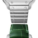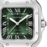 Santos de Cartier – precision meets minimalism Dedicated to aviation pioneer Alberto Santos-Dumont Presented in a beautifully proportioned square steel case Graduated green dial with polished steel sword-shaped hands Powered with precision by the calibre 1847 MC self-winding mechanical movement with a 40-hour power reserve A SIGNATURE AESTHETIC Created in 1904, the Santos de Cartier collection pays tribute to aviation pioneer Alberto Santos-Dumont who inspired the original watch. Based on the concept of form, a taste for minimalism, the precision of proportions, and an eye for detail, the collection is characterised by its square case with rounded corners and functional screws that are deliberately left visible. AN EYE FOR DETAIL This 41.9 x 35.1mm watch is presented in a steel case with rounded corners and visible screws. A 7-sided crown with a vibrant faceted blue spinel adds to the signature aesthetic. The graduated green dial is rich and luxurious, with a sunray finish, steel Roman numerals, and steel sword-shaped hands. This statement timepiece is supplied with two straps – one in green alligator leather and the other in steel – allowing you to configure an accessory that feels uniquely yours. Water resistant to 10 bar (100 metres) and equipped with a calibre 1847 MC self- winding mechanical movement, this exquisite model prioritises function and form.