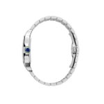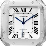 Santos watch, large model, mechanical movement with automatic winding, calibre 1847 MC. Steel case, 7-sided crown set with a faceted synthetic spinel, silvered opaline dial, steel sword-shaped hands, sapphire crystal. Steel bracelet with ??SmartLink?? adjustment system. Second bracelet in calfskin, with interchangeable steel folding buckle. Both bracelets are fitted with the ??QuickSwitch?? interchangeability system. Case width: 39.8 mm, thickness: 9.38 mm. Water-resistant to 10 bar (approx. 100 metres).