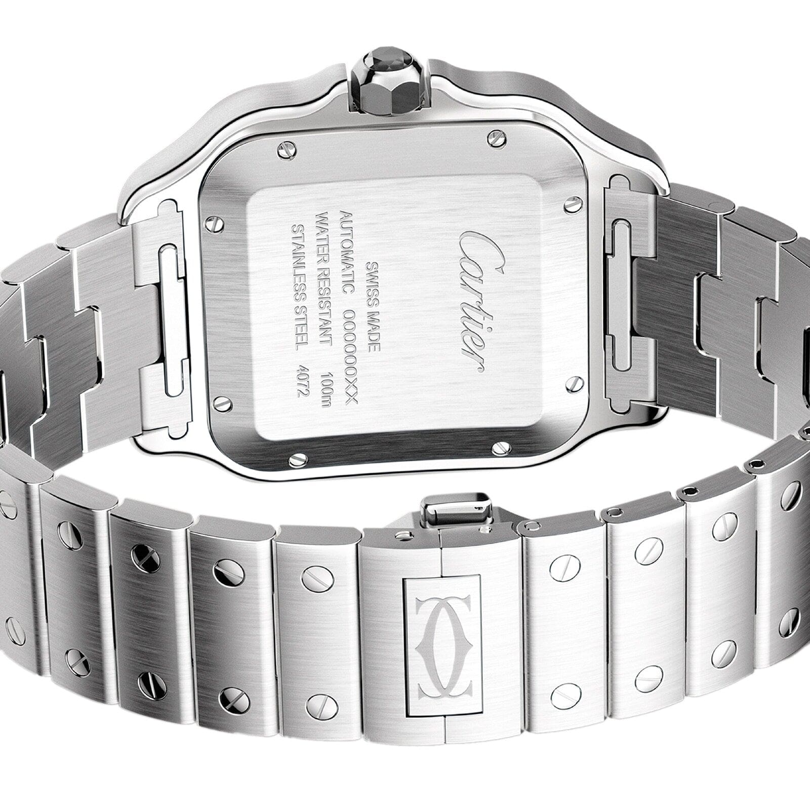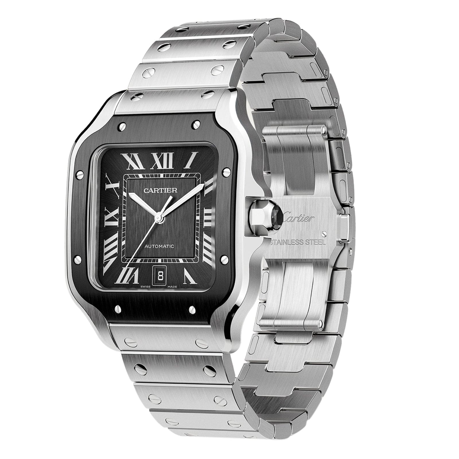 Santos de Cartier watch, large model, Manufacture mechanical movement with automatic winding, caliber 1847 MC. Steel case, ADLC bezel, steel crown set with a faceted black synthetic spinel, gray dial, steel sword-shaped hands with luminescent material, sapphire crystal. Steel bracelet with “SmartLink” adjustment system. Second strap in black rubber, with interchangeable steel deployant buckle. Both bracelets are fitted with the “QuickSwitch” interchangeability system. Case width: 39.8 mm, thickness: 9.38 mm. Water-resistant up to 10 bar (approx. 100 meters/100 feet). 1904, Louis Cartier granted the wish of the famous Brazilian aviator Alberto Santos Dumont: to be able to tell time while flying. The birth of one of the first ever wristwatches sealed the bonds of friendship between these two pioneers. The rounded angles of the dial, the seamless curve of the horns, and the exposed screws made for an iconic watch that would inspire countless reinterpretations. Explore the full Cartier range here.