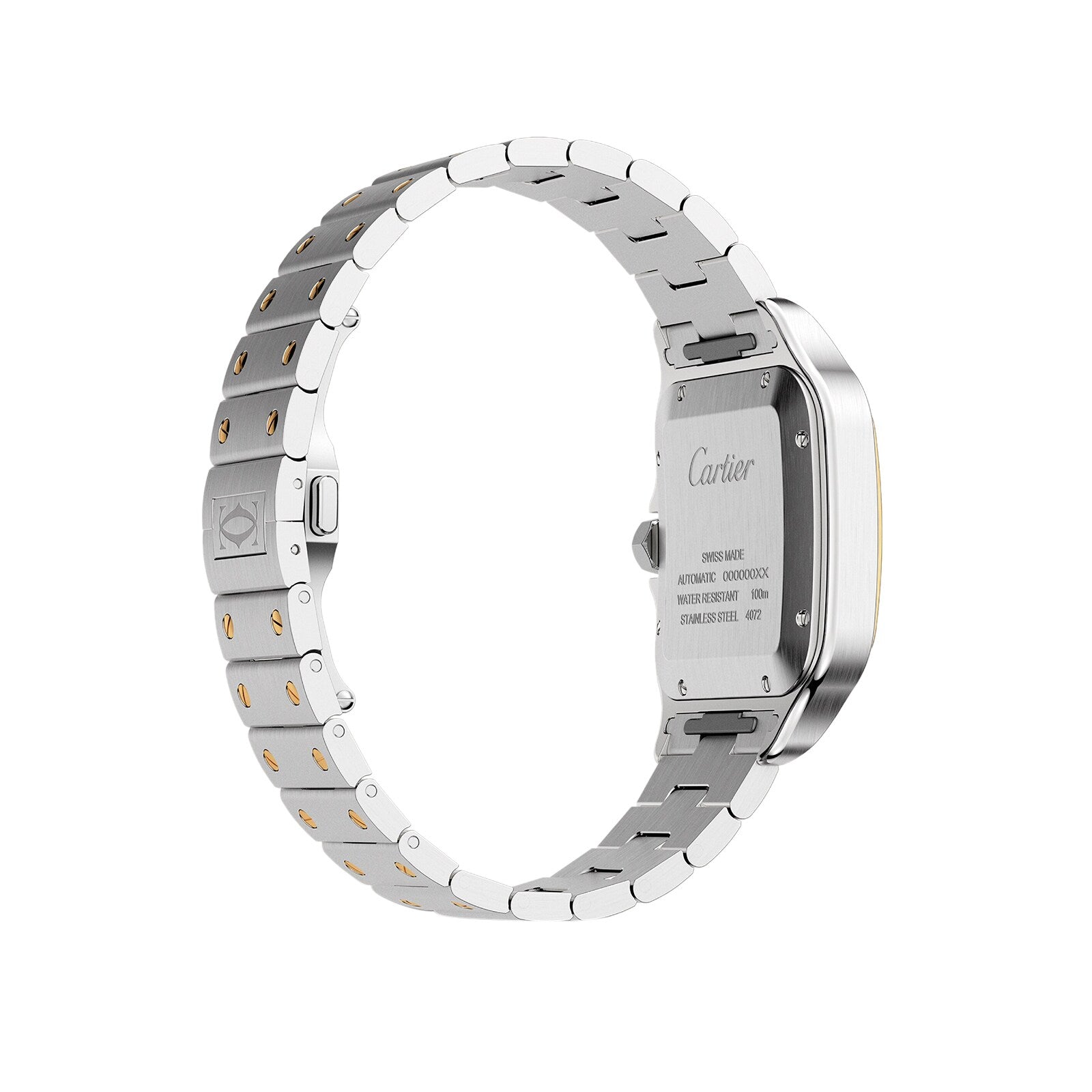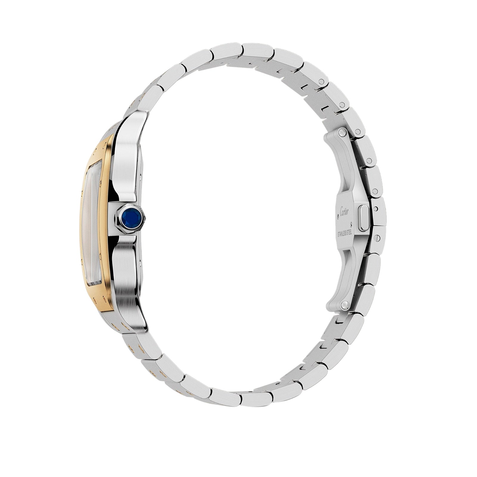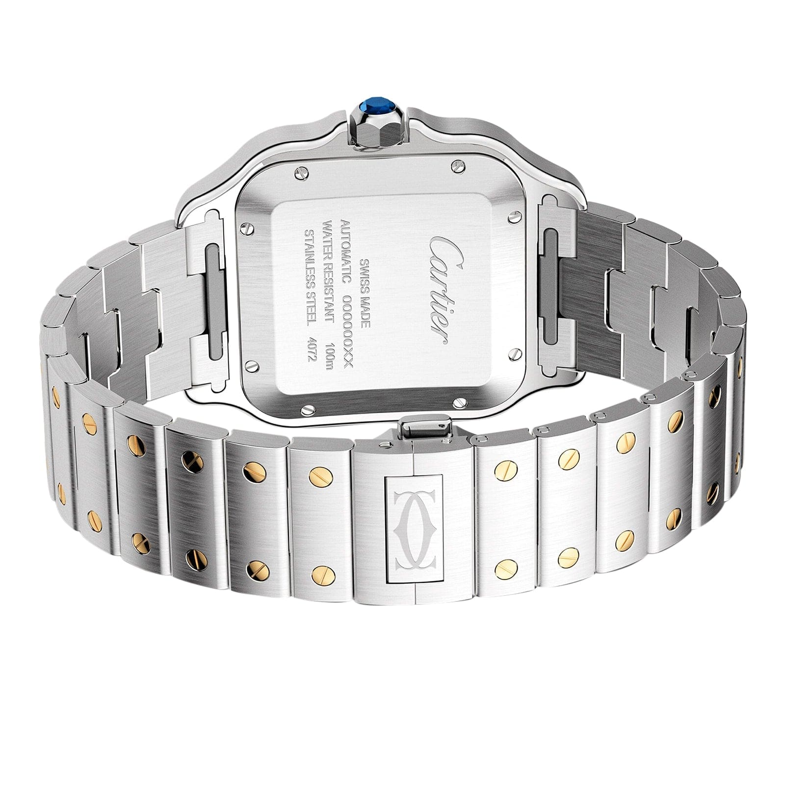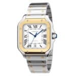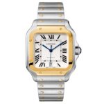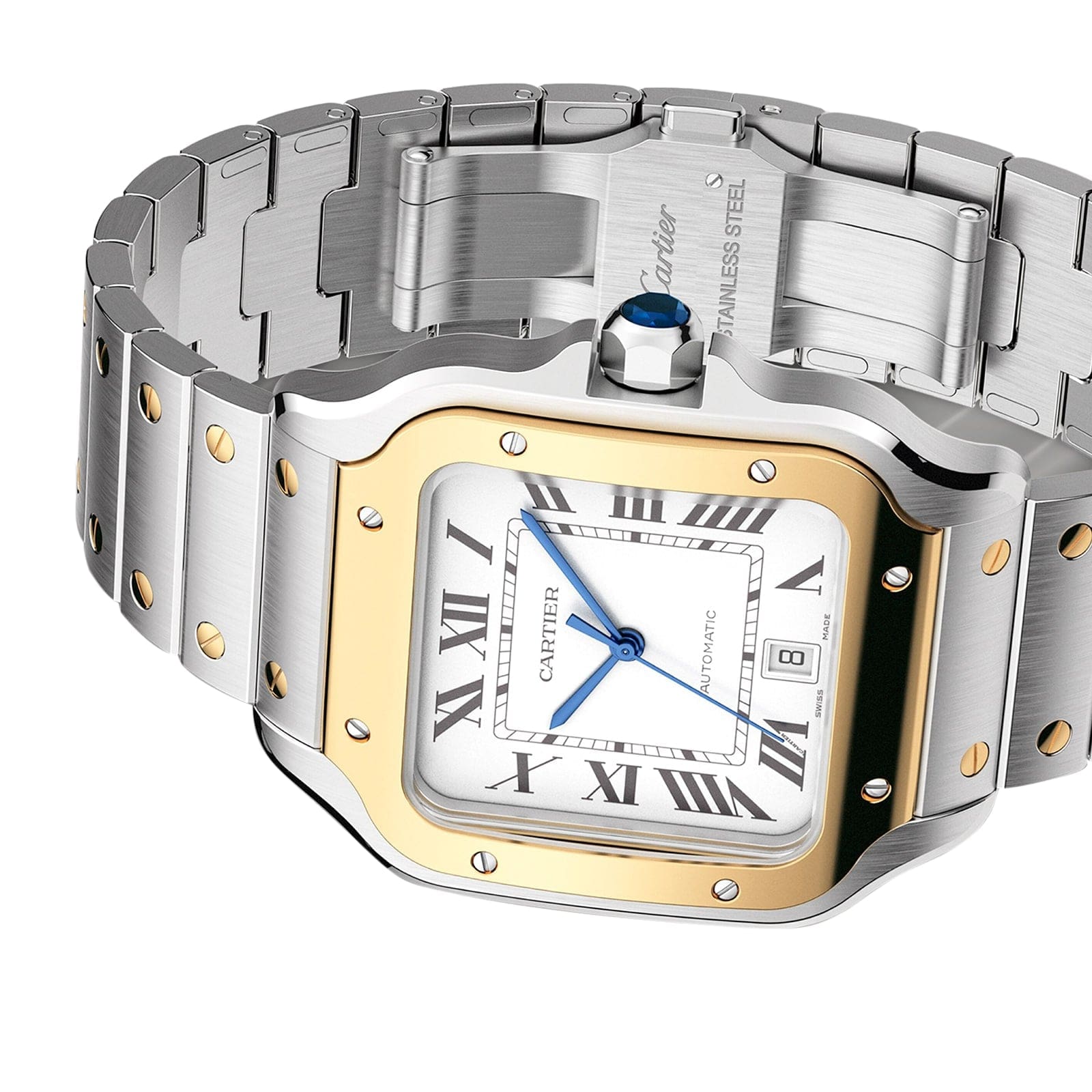Santos de Cartier – a taste for minimalism Dedicated to aviation pioneer Alberto Santos-Dumont Housed in a beautifully proportioned square steel case with an 18K yellow gold bezel Blued-steel sword-shaped hands move gracefully across the silvered opaline dial Powered by the calibre 1847 MC self-winding mechanical movement, complete with a 40-hour power reserve A TASTE FOR MINIMALISM Created in 1904, the Santos de Cartier collection pays tribute to aviation pioneer Alberto Santos-Dumont who inspired the original watch. Based on the concept of form, a taste for minimalism, the precision of proportions, and an eye for detail, the collection is characterised by its square case with rounded corners and functional screws that are deliberately left visible. AN EYE FOR DETAIL This 41.9 x 35.1mm watch is presented in a steel case with rounded corners and visible screws. A 7-sided crown with a vibrant faceted blue spinel adds to the signature aesthetic. Framed by warm yellow golf, the silvered opaline dial embraces the brand’s signature aesthetic, with steel Roman numerals and blued-steel sword-shaped hands. Designed to enable two distinct configurations, this model is supplied with two straps – one in brown calfskin leather and the other in steel with yellow gold screws. Water resistant to 10 bar (100 metres) and equipped with a calibre 1847 MC self-winding mechanical movement, this sophisticated timepiece effortlessly balances function and form.