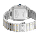 Santos watch, medium model, mechanical movement with automatic winding, calibre 1847 MC. Steel case, 18K yellow gold bezel set with 206 brilliant-cut diamonds totalling 0.64 carats. 7-sided crown set with a faceted synthetic spinel, golden sunray dial, blued- steel sword-shaped hands, sapphire crystal. Steel bracelet with SmartLink adjustment system. Second strap in alligator skin, interchangeable steel folding buckle. Both are fitted with the QuickSwitch interchangeable system. Case width: 35.1 mm, thickness: 8.83 mm. Water-resistant to 10 bar (approx. 100 metres).