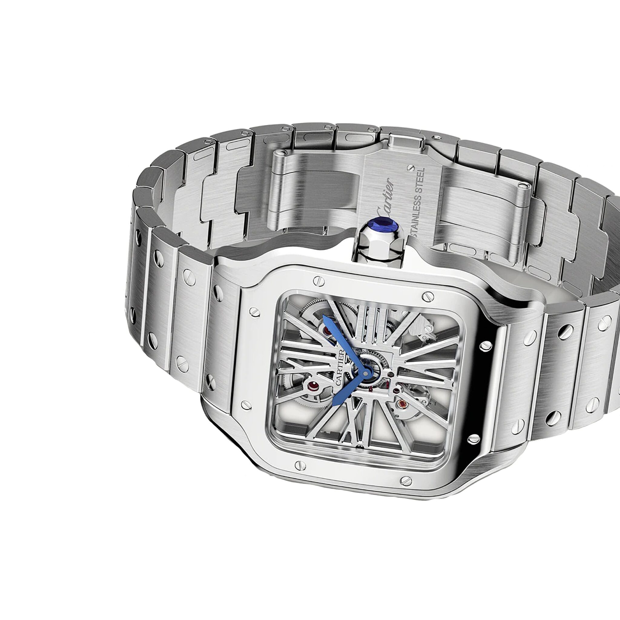 Santos Skeleton watch, large model, Manufacture mechanical movement with manual winding, caliber 9611 MC. Steel case, heptagonal crown set with a faceted sapphire, blued-steel sword-shaped hands, sapphire crystal and case back. Steel bracelet with ??SmartLink?? adjustment system. Second bracelet in alligator leather, with steel interchangeable deployant buckle. Both bracelets are equipped with the ??QuickSwitch?? interchangeability system. Hours and minutes with skeletonized bridges forming Roman numerals. Individually numbered movement consisting of 138 parts including 20 rubies. Movement dimensions: 28 mm x 28 mm, movement thickness: 3.97 mm, balance: 28,800 vibrations/hour, power reserve approx. 72 hours. Case width: 39.8 mm, thickness: 9.08 mm. Water-resistant up to 10 bar (approx. 100 meters/330 feet). 1904, Louis Cartier granted the wish of the famous Brazilian aviator Alberto Santos Dumont: to be able to tell time while flying. The birth of one of the first ever wristwatches sealed the bonds of friendship between these two pioneers. The rounded angles of the dial, the seamless curve of the horns, and the exposed screws made for an iconic watch that would inspire countless reinterpretations.