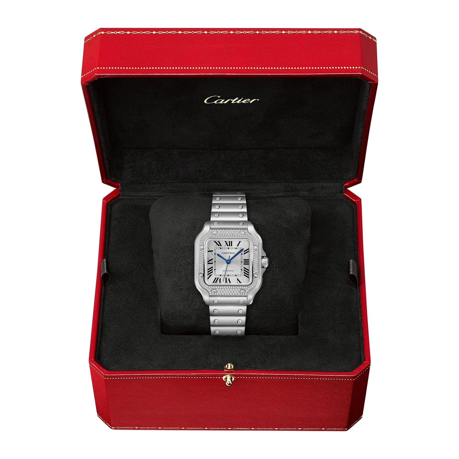 Santos watch, medium model, mechanical movement with automatic winding, caliber 1847 MC. Steel case, steel bezel set with 206 brilliant-cut diamonds totaling 0.64 carats. Heptagonal crown set with a faceted synthetic spinel, sunray dial, blued-steel sword- shaped hands, sapphire crystal. Steel bracelet with ??SmartLink?? adjustment system. Second bracelet in calfskin, with steel interchangeable deployant buckle. Both bracelets are equipped with the ??QuickSwitch?? interchangeability system. Case width: 35.1 mm, thickness: 8.83 mm. Water-resistant up to 10 bar (approx. 100 meters/330 feet). 1904, Louis Cartier granted the wish of the famous Brazilian aviator Alberto Santos Dumont: to be able to tell time while flying. The birth of one of the first ever wristwatches sealed the bonds of friendship between these two pioneers. The rounded angles of the dial, the seamless curve of the horns, and the exposed screws made for an iconic watch that would inspire countless reinterpretations.