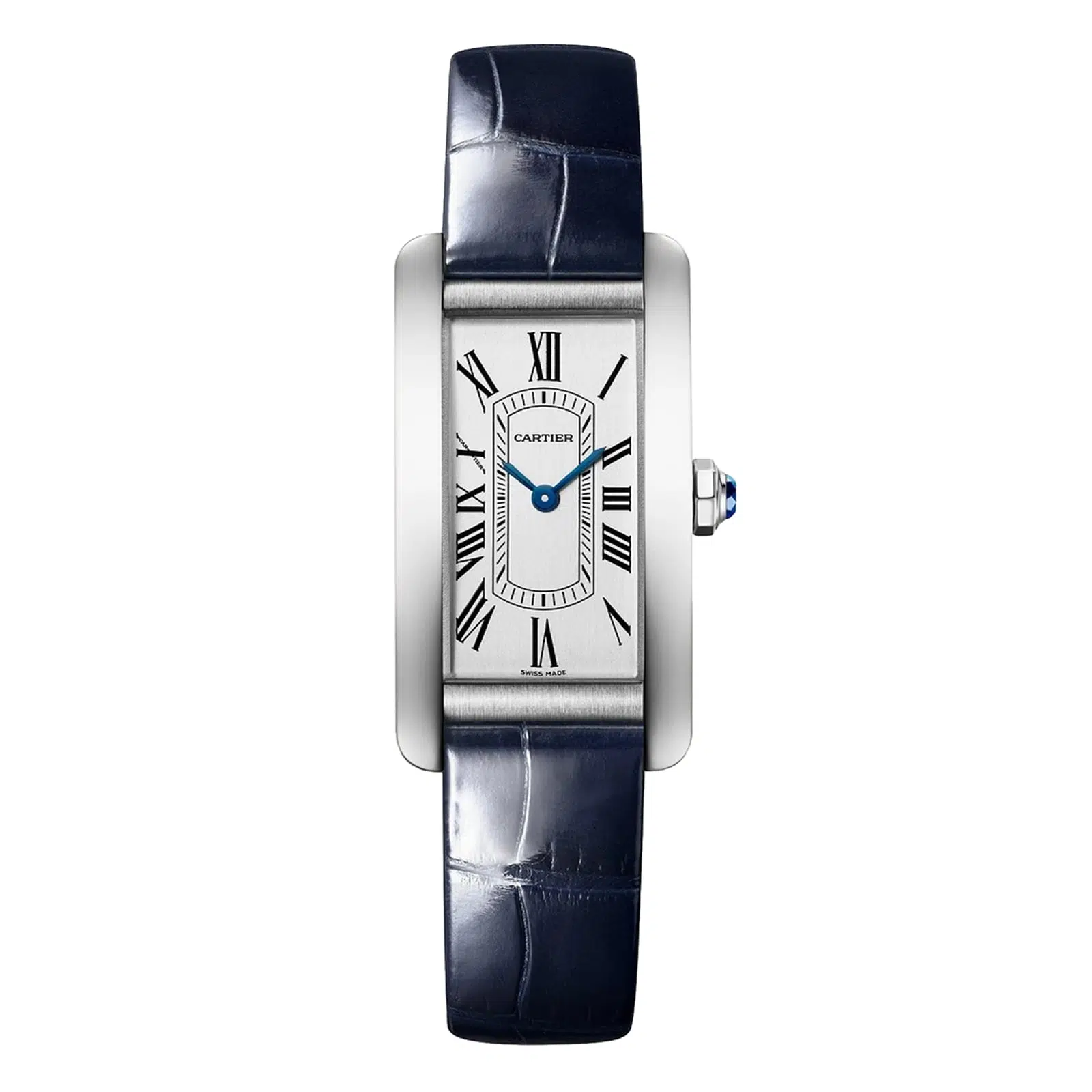 Tank Am??ricaine watch, mini model, quartz movement. Steel case. Faceted crown with a faceted synthetic blue spinel. Silvered sunray dial, blued-steel sword-shaped hands, sapphire crystal. Shiny blue alligator-skin strap, steel ardillon buckle. Case dimensions: 28 mm x 15.2 mm, thickness: 6.5 mm. Water-resistant up to 3 bar (approx. 30 metres).