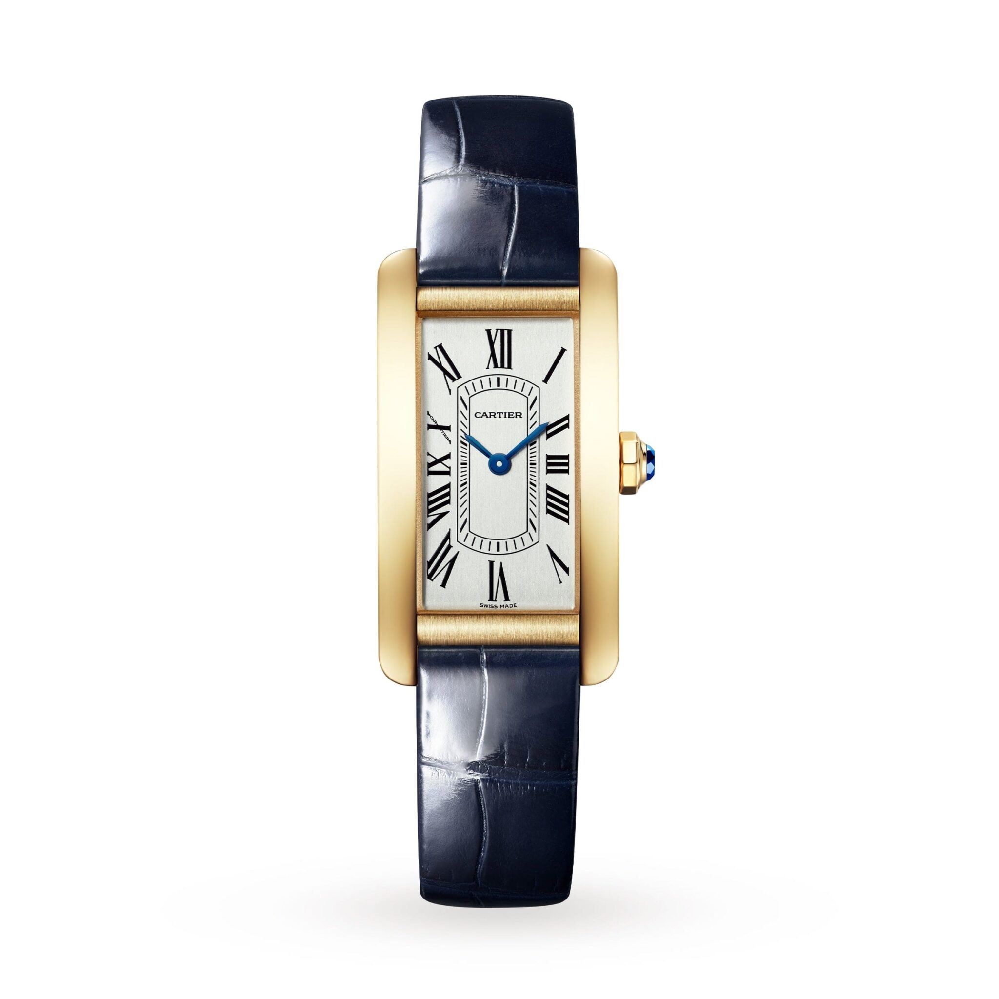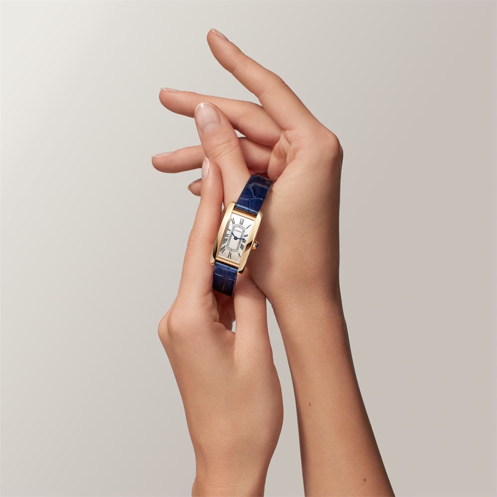 Tank Am??ricaine watch, small model, high autonomy quartz movement. 18K yellow gold (750/1000) case, faceted crown set with a faceted sapphire. Silvered satin-brushed dial, blued-steel sword-shaped hands, sapphire crystal. Shiny navy blue alligator leather strap, 18K yellow gold (750/1000) ardillon buckle. Case dimensions: 35.4 mm x 19.4 mm, thickness: 6.8 mm. Water-resistant up to 3 bar (approx. 30 meters/100 feet).