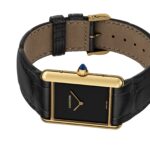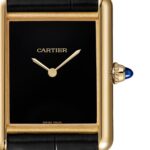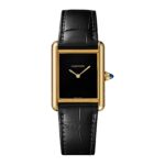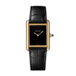 Tank Louis Cartier watch, large model, Manufacture mechanical movement with manual winding. Case in yellow gold 750/1000, beaded crown set with a sapphire, black lacquer dial, golden-finish steel sword-shaped hands, mineral crystal, semi-matte black alligator- skin strap, ardillon buckle in yellow gold 750/1000. Case dimensions: 33.7 mm x 25.5 mm, thickness: 6.6 mm. Water-resistant to 30 metres.