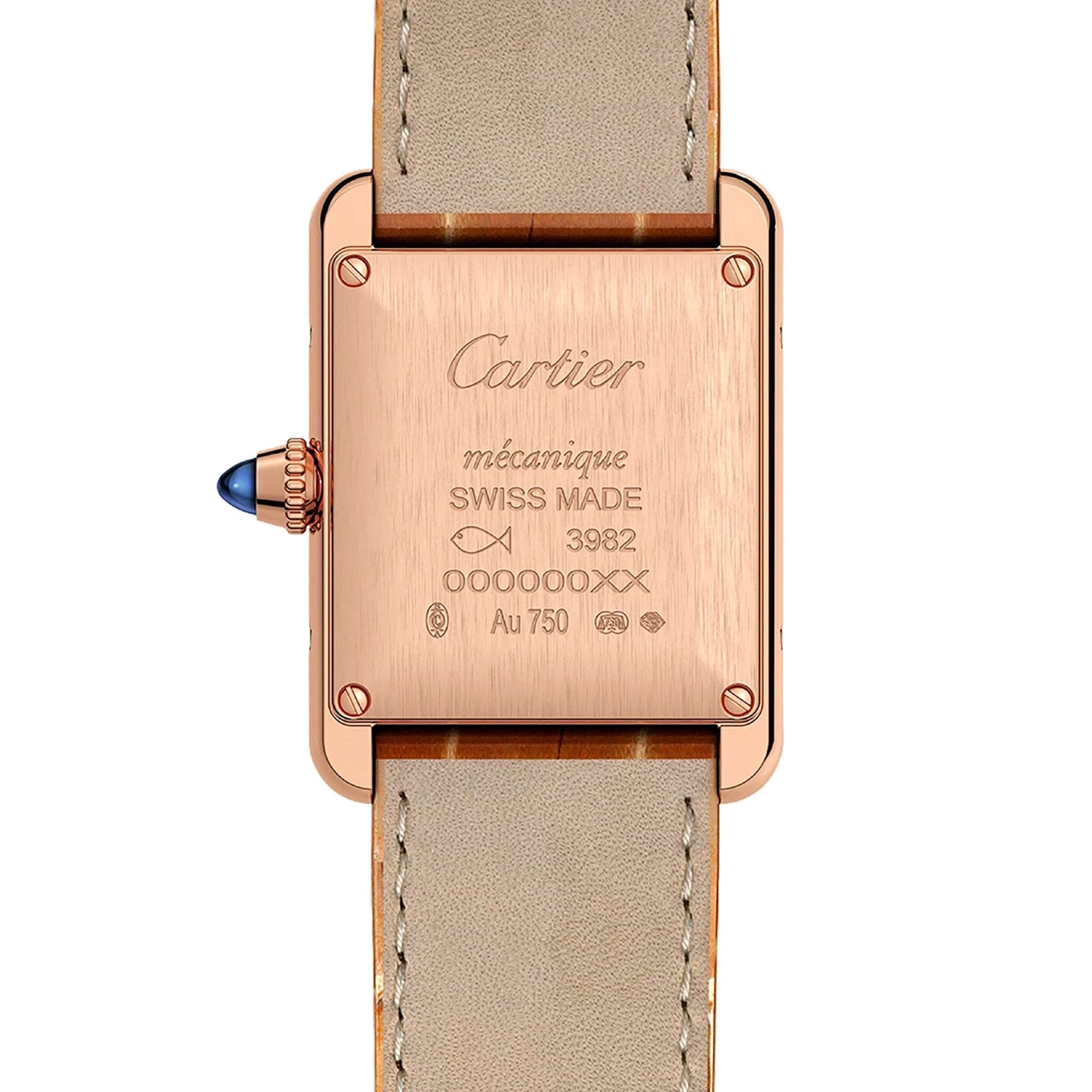 Tank Louis Cartier watch, small model, Manufacture mechanical movement with manual winding, calibre 8971 MC. Case in rose gold 750/1000, beaded crown set with a sapphire cabochon, silvered beaded dial, blued-steel sword-shaped hands, mineral crystal, strap in shiny brown alligator skin, ardillon buckle in rose gold 750/1000. Case dimensions: 29.5 mm x 22.0 mm, 6.8 mm thick. Water- resistant to 3 bar (30 metres).
