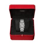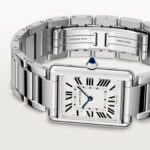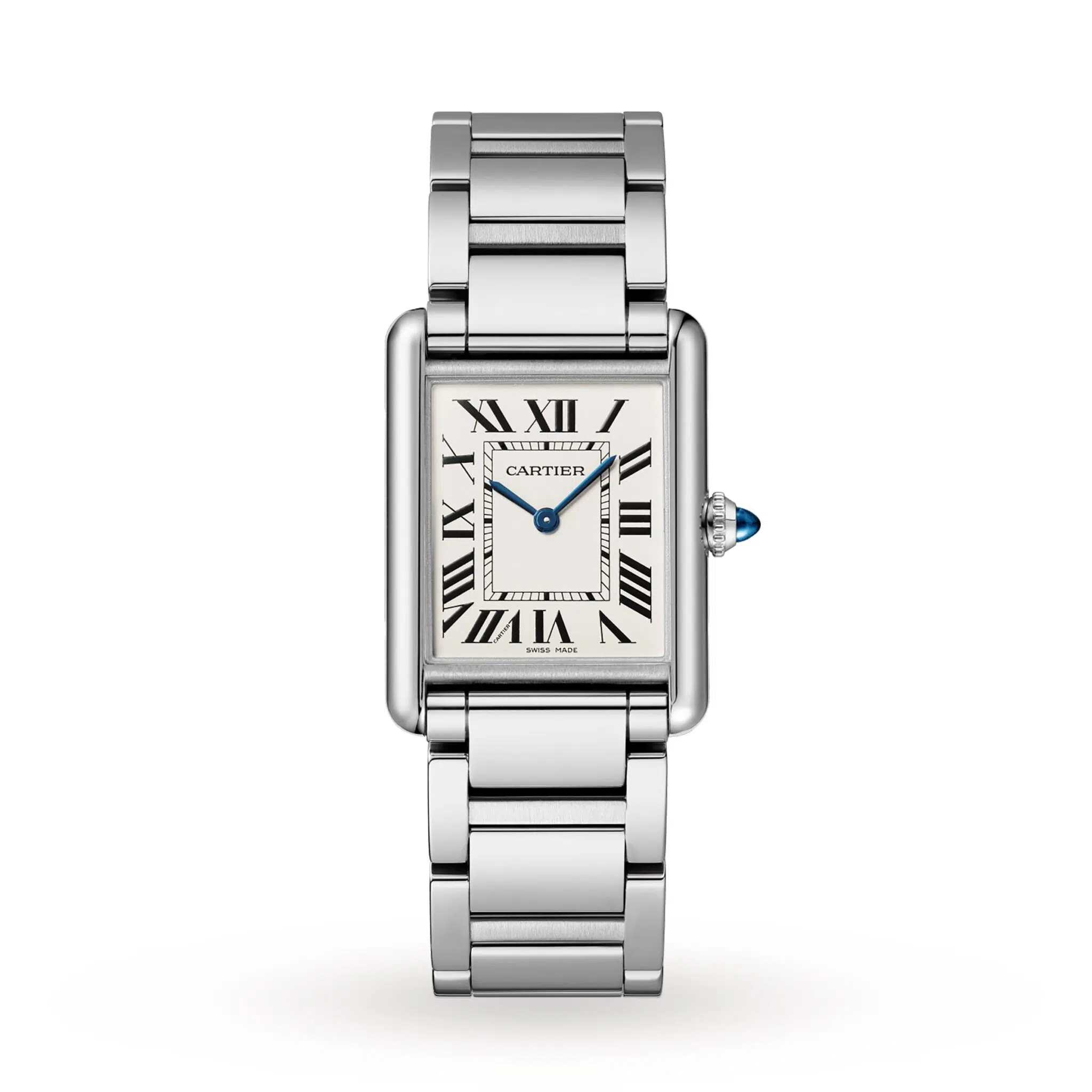 Tank Must watch, large model, high autonomy quartz movement. Steel case, beaded crown set with a synthetic cabochon-shaped spinel, silvered dial, blued-steel sword-shaped hands, interchangeable steel bracelet. Case dimensions: 33.7 mm x 25.5 mm, thickness: 6.6 mm. Water-resistant up to 3 bar (approx. 30 meters/100 feet).