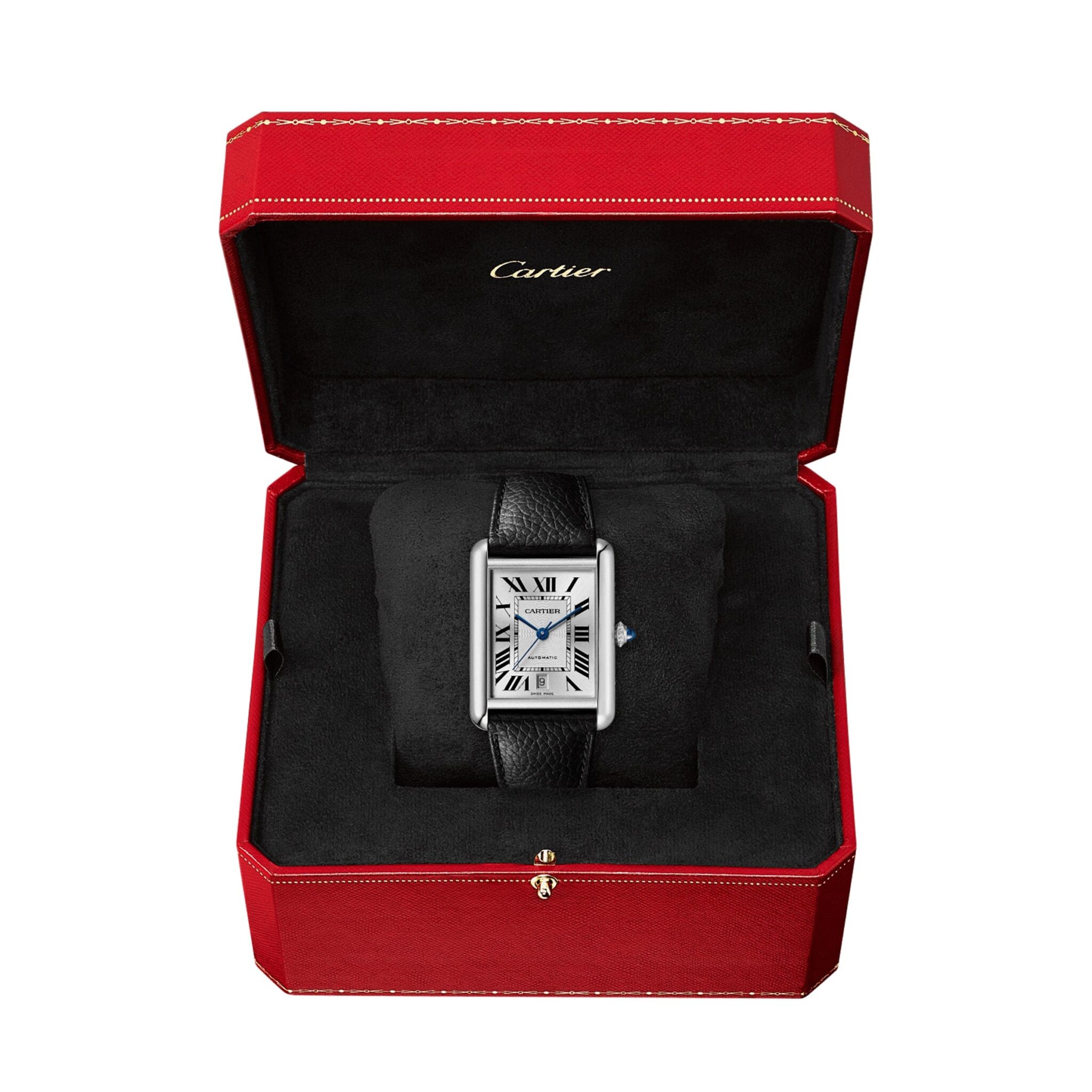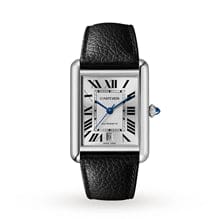 Tank Must watch, extra-large model, mechanical movement with automatic winding, calibre 1847 MC. Steel case, beaded crown set with a synthetic cabochon-shaped spinel, silvered flinqu?? dial, blued-steel sword-shaped hands, black grained calfskin strap, interchangeable steel folding buckle, calendar aperture at 6 o’clock. Case dimensions: 41 mm x 31 mm, thickness: 8.4 mm. Water- resistant to 3 bar (approx. 30 metres).
